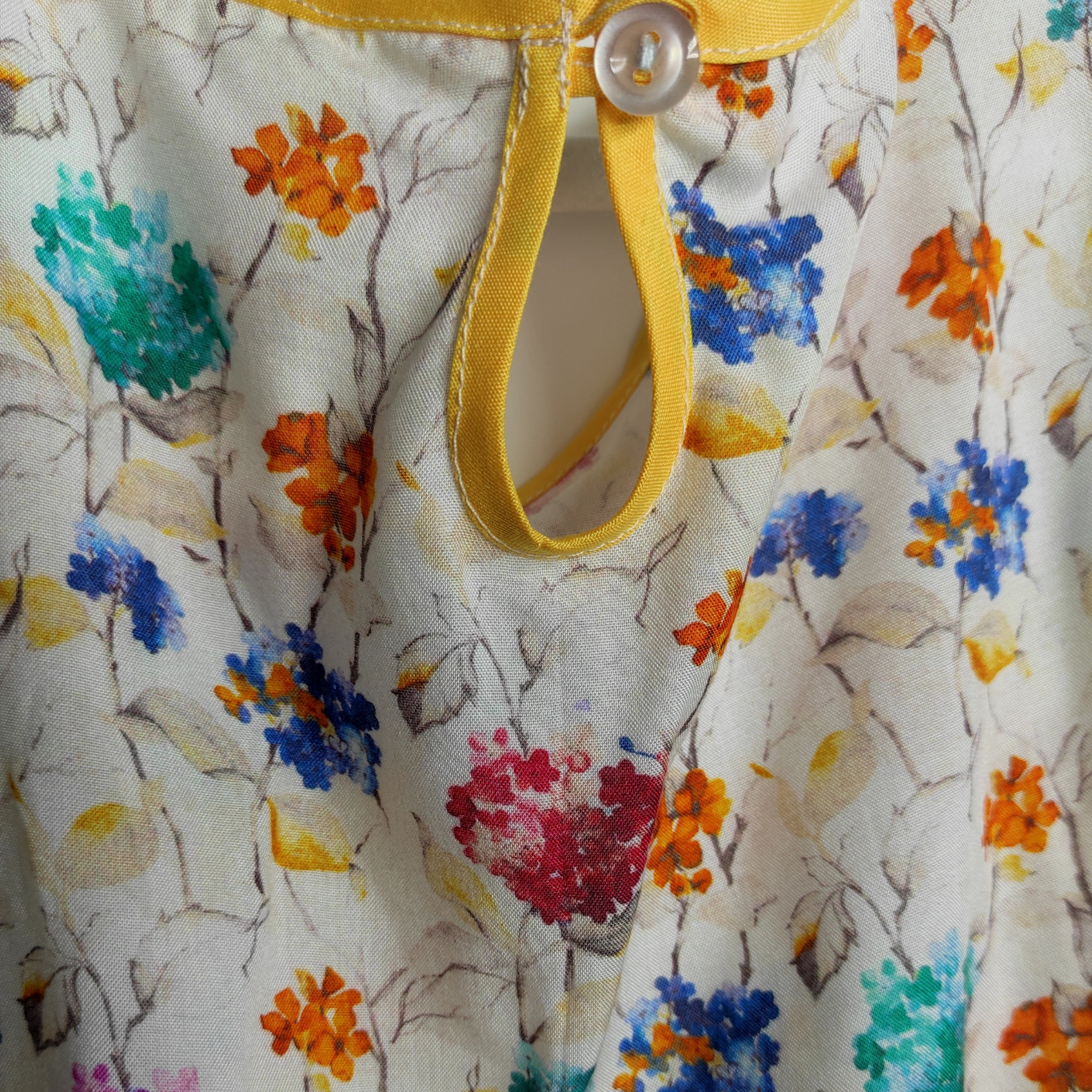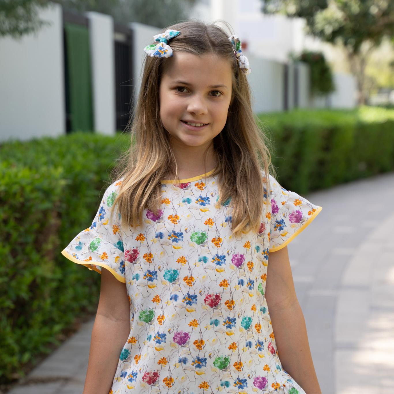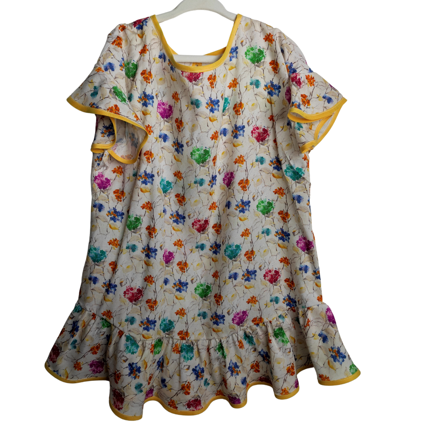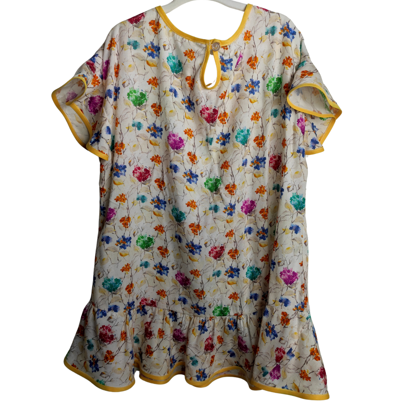 Fresh as a spring breeze, this light and flowy dress bursts with colorful florals on a creamy white background. Accented with soft flutter sleeves and a ruffled hem trimmed in sunny yellow piping, it blends comfort and charm for playful days or dressed-up occasions. Whether worn solo or layered as a tunic, it’s a beautiful statement piece that celebrates color and joy.