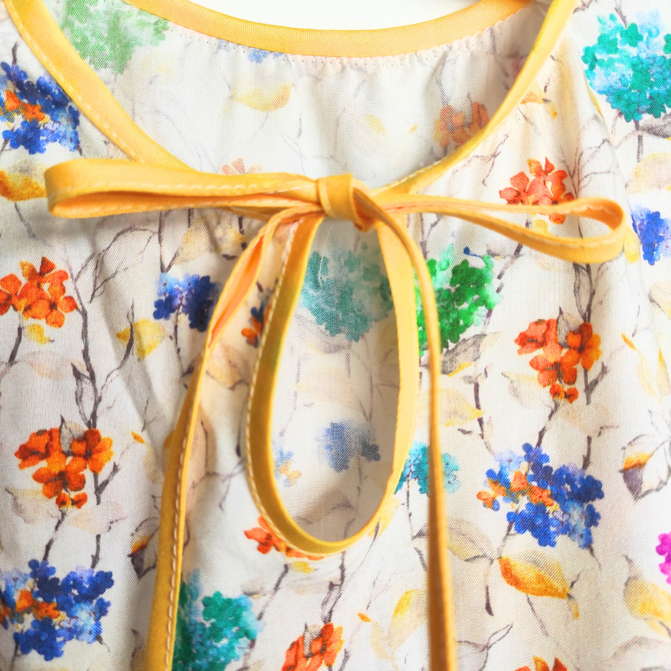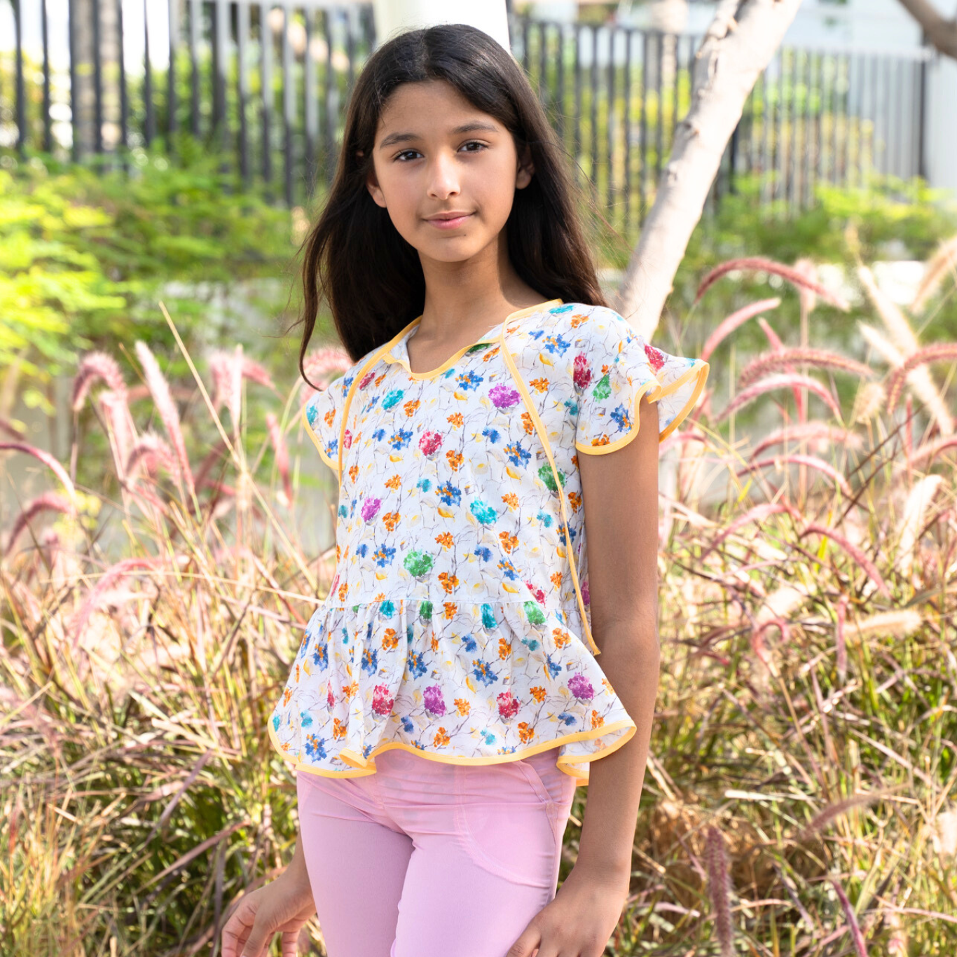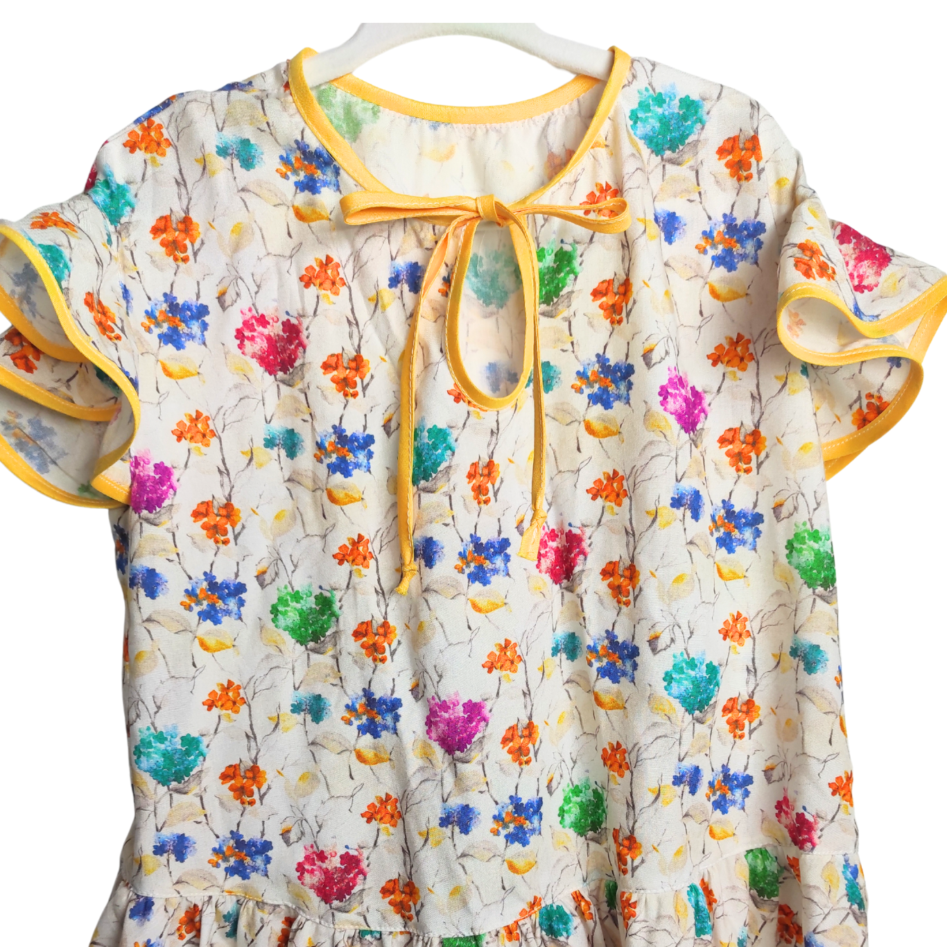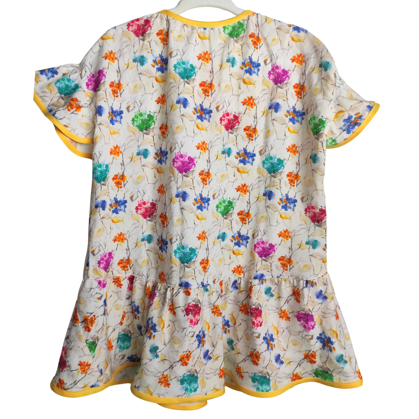 Whether styled as a flowy blouse or a short summer dress, this cheerful floral tunic is a burst of joy. Featuring a multicolor hand-drawn flower print on a light cream base, it’s finished with playful ruffles at the hem and flutter sleeves trimmed in bright yellow piping. The lightweight fabric and easy silhouette make it a perfect pick for sunny days, special outings, or casual layering.