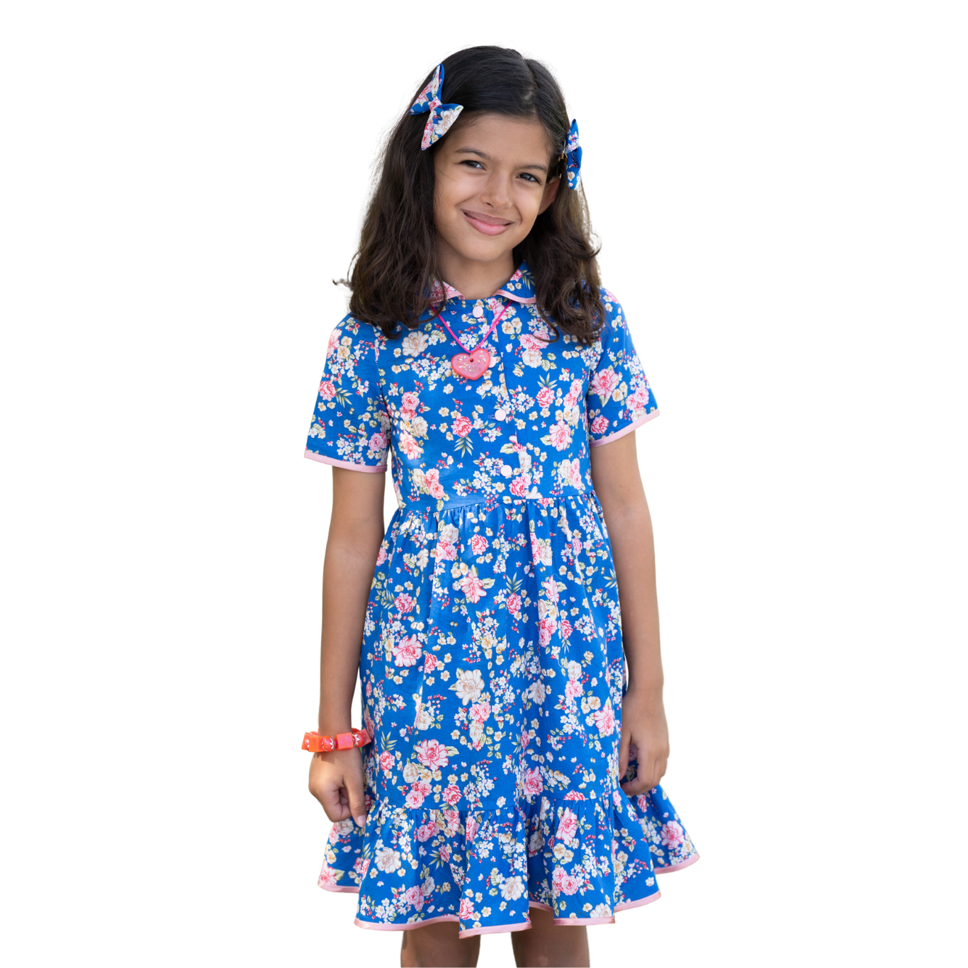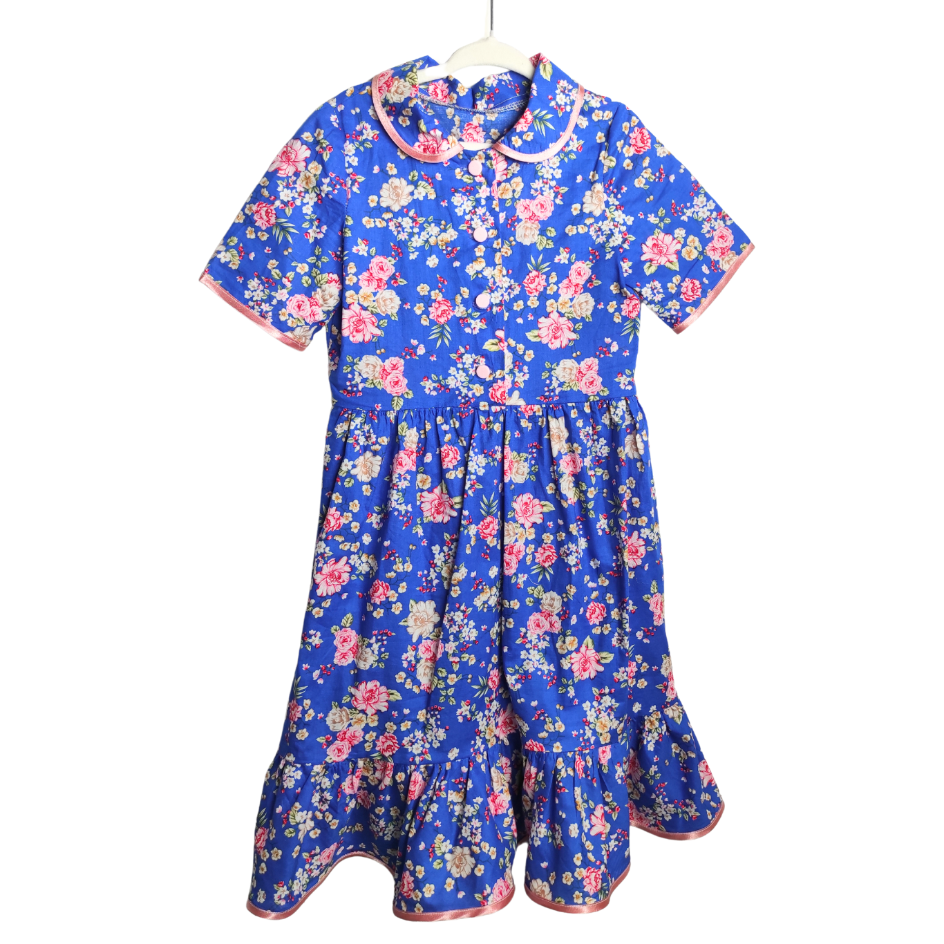 A timeless favorite with a modern twist, this dress features a rich cobalt blue backdrop sprinkled with delicate pink, ivory, and cream florals. The tailored fit includes a gently flared skirt, short sleeves with pink piping, and a rounded collar that adds a touch of vintage sweetness. Perfect for everything from garden parties to everyday elegance.