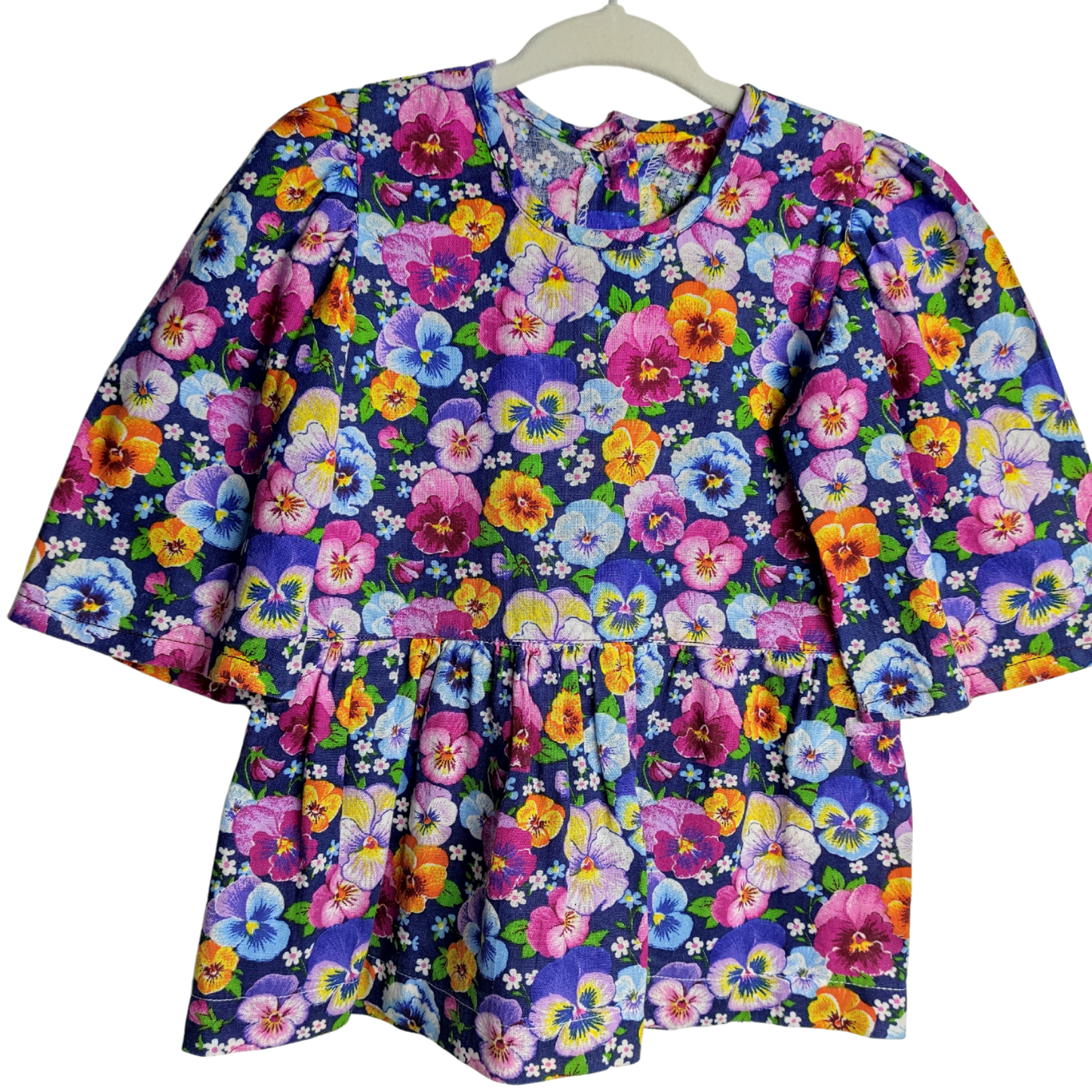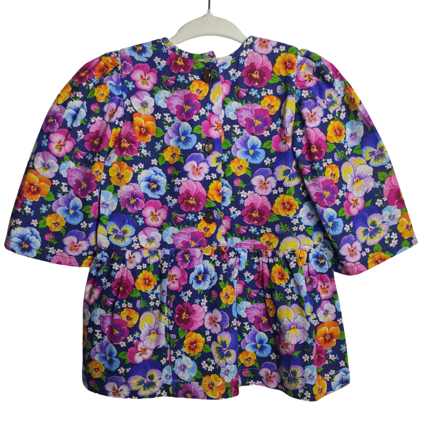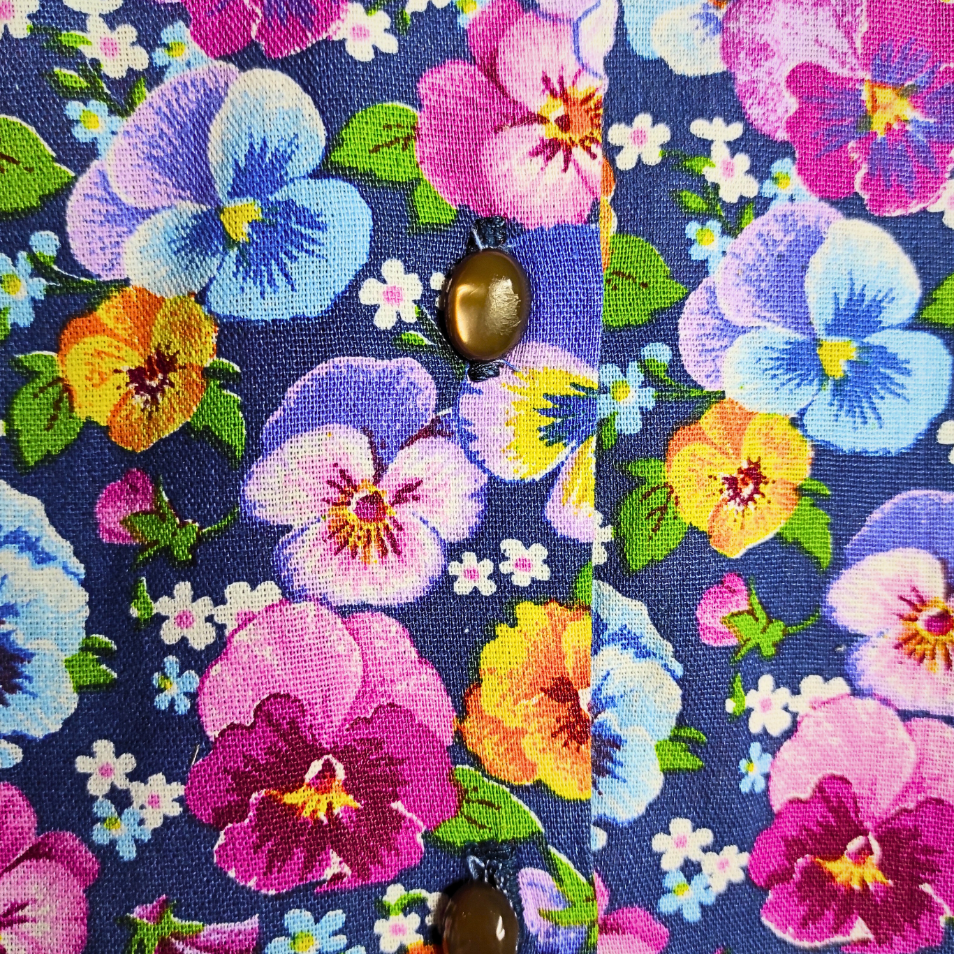 Let your little one bloom in this joyful explosion of color. Set against a deep navy background, this handcrafted cotton dress bursts with pansy-inspired florals in vibrant pinks, purples, yellows, and blues. The puffed shoulders and softly gathered waist add a touch of classic charm while ensuring all-day comfort and freedom to move.