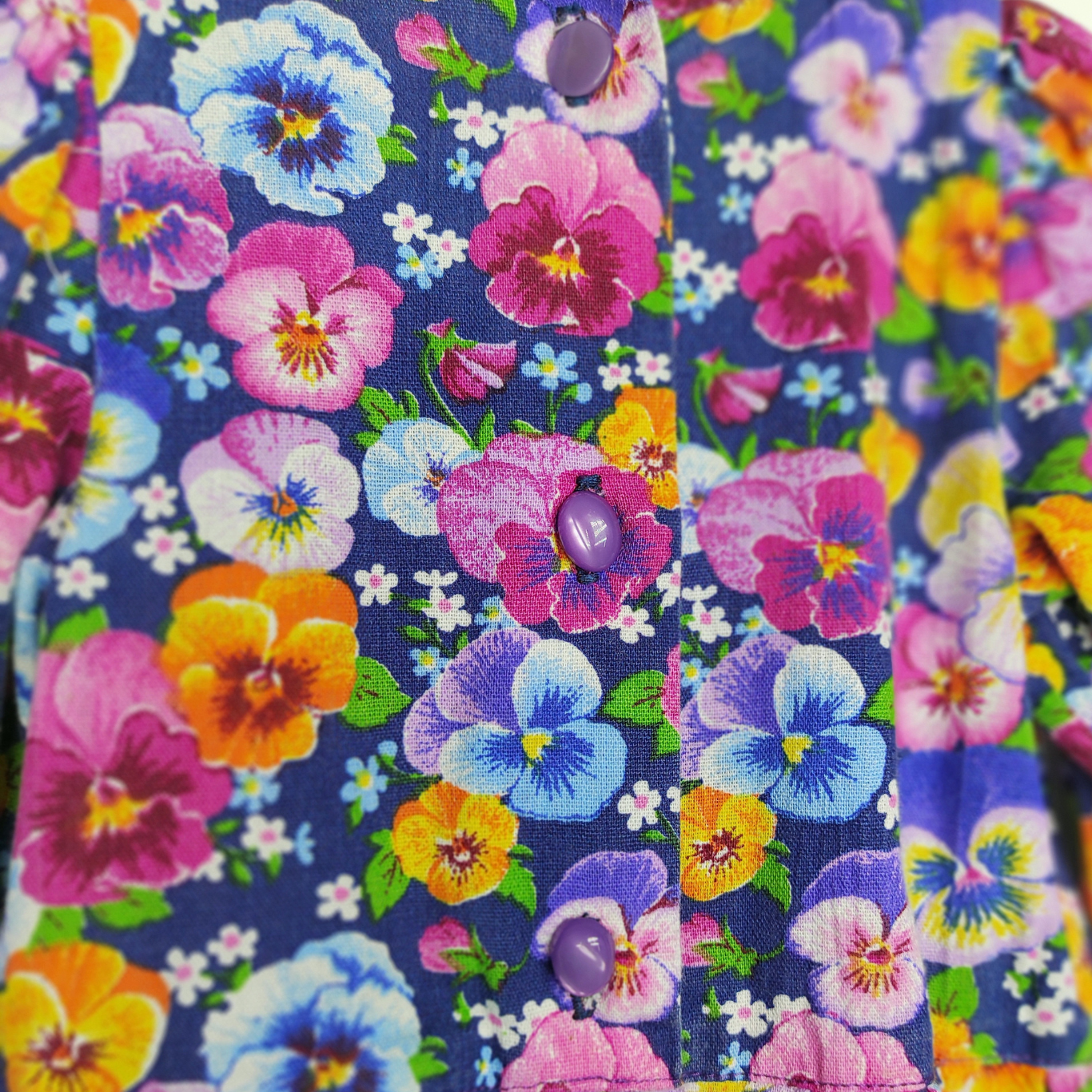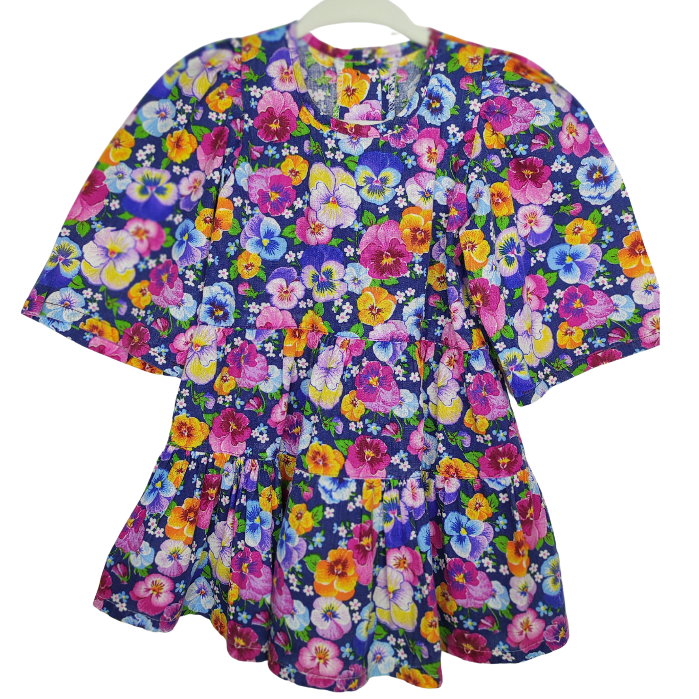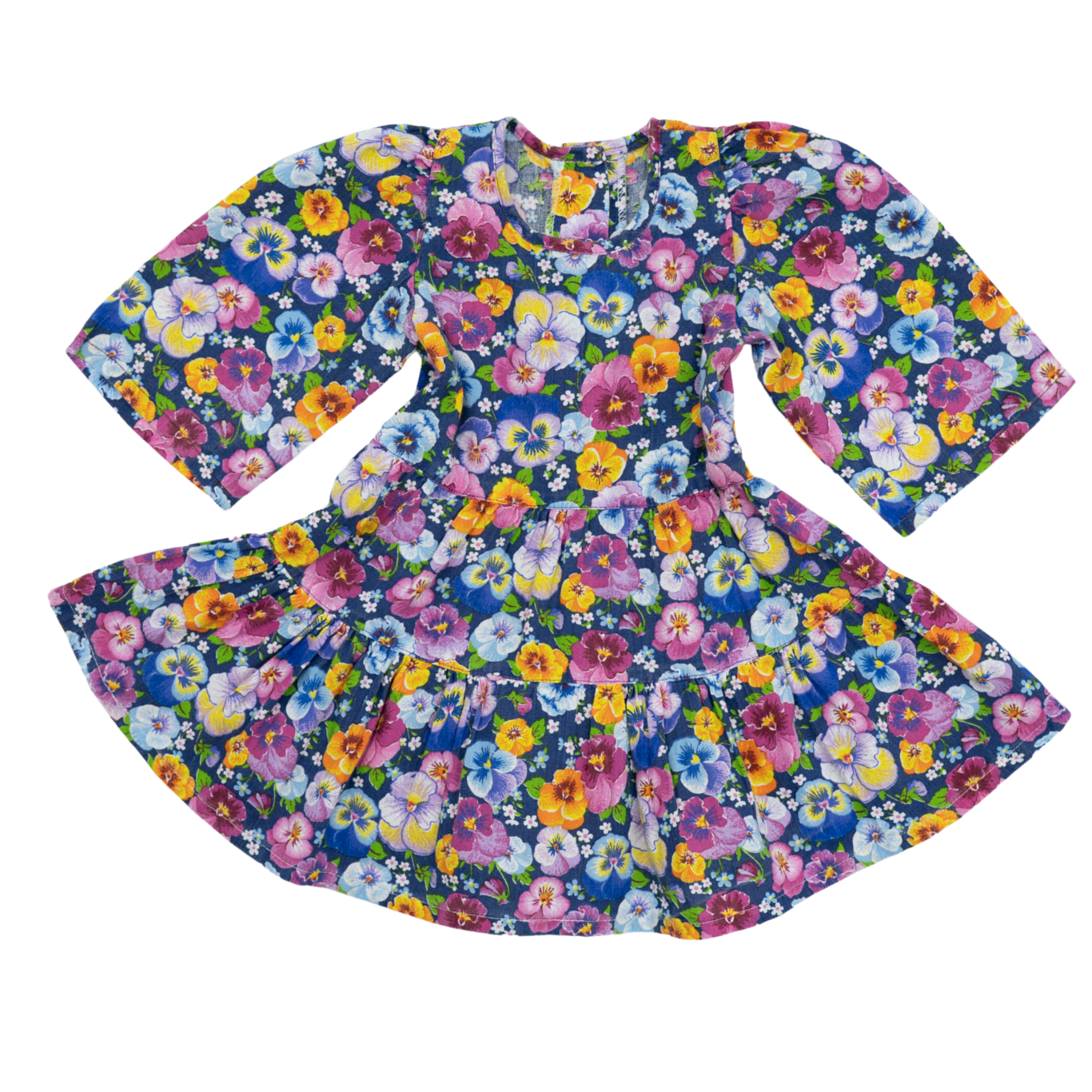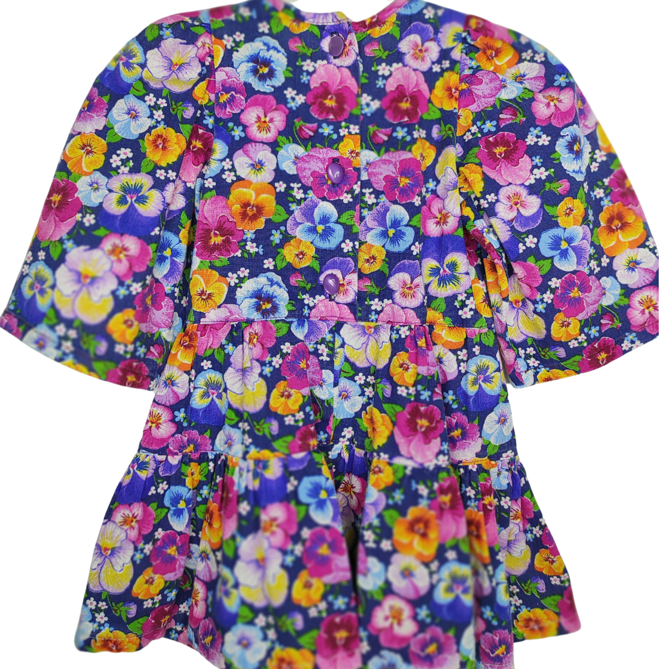 Let your little one bloom in this joyful explosion of color. Set against a deep navy background, this handcrafted cotton dress bursts with pansy-inspired florals in vibrant pinks, purples, yellows, and blues. The puffed shoulders and softly gathered waist add a touch of classic charm while ensuring all-day comfort and freedom to move.