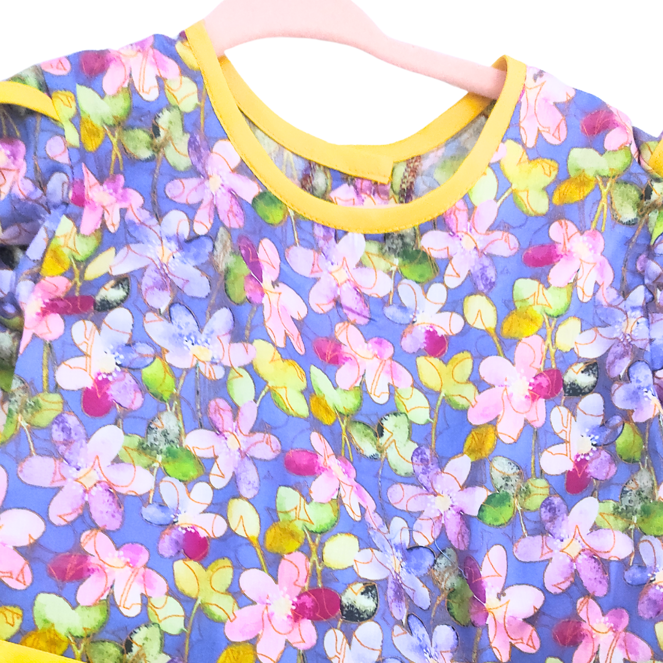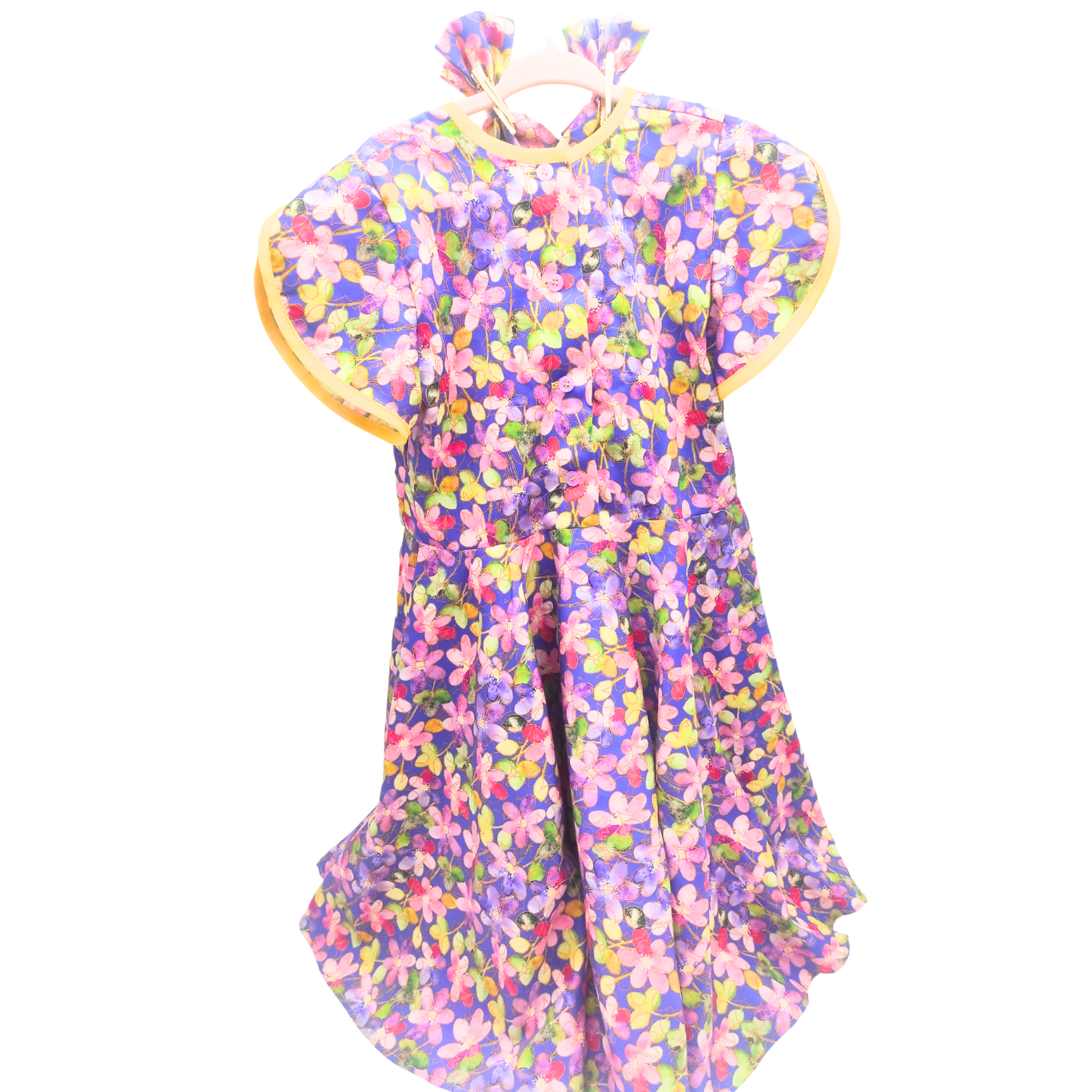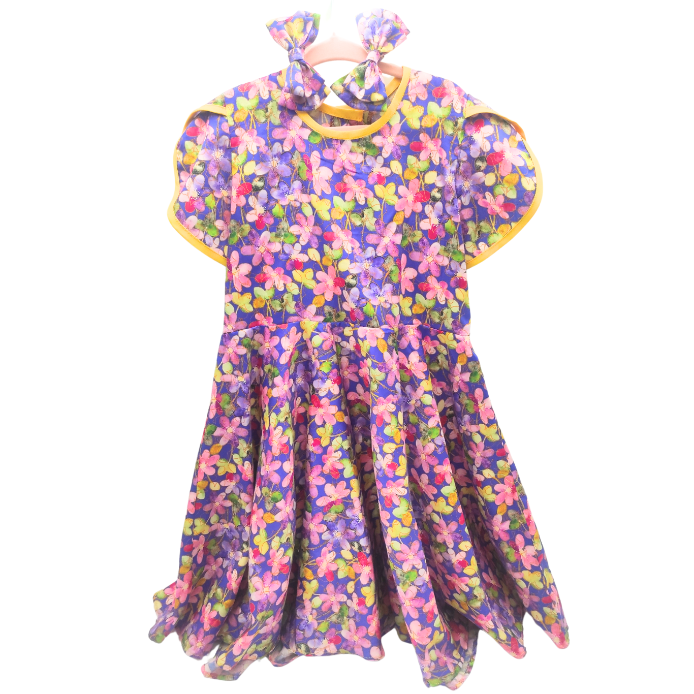 Colorful, twirly, and full of cheer! This vibrant floral dress is made to bring smiles. With a bold mix of pink, purple, yellow, and green blossoms on a violet background, it's trimmed with sunny yellow piping for a crisp finish. The cap sleeves and full gathered skirt make it perfect for dancing, twirling, and celebrating childhood joy. Comes with two matching bows to complete the look.