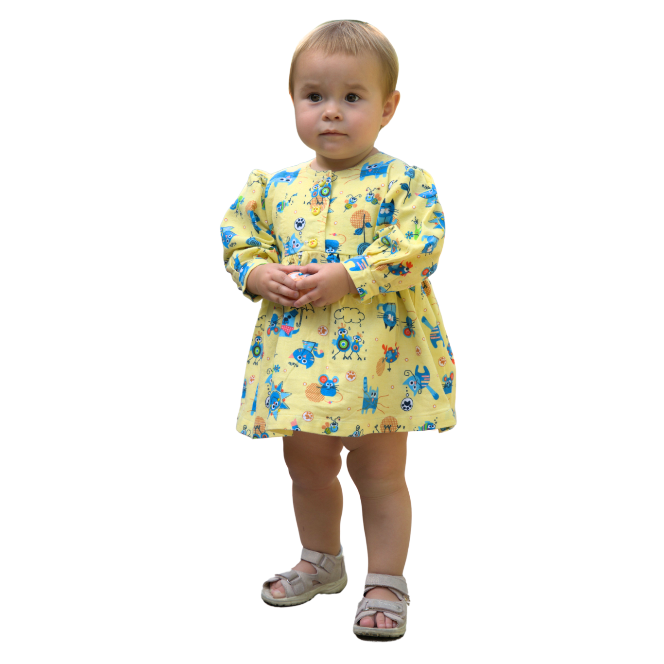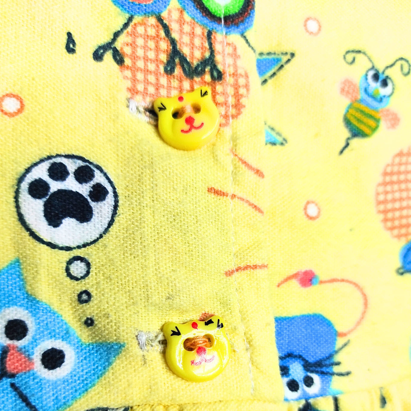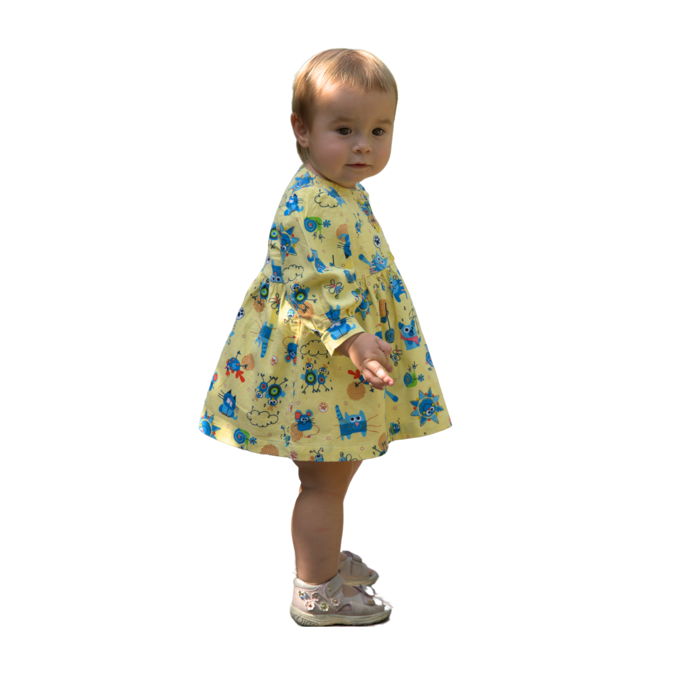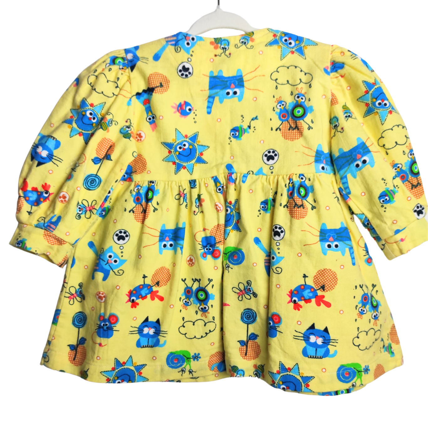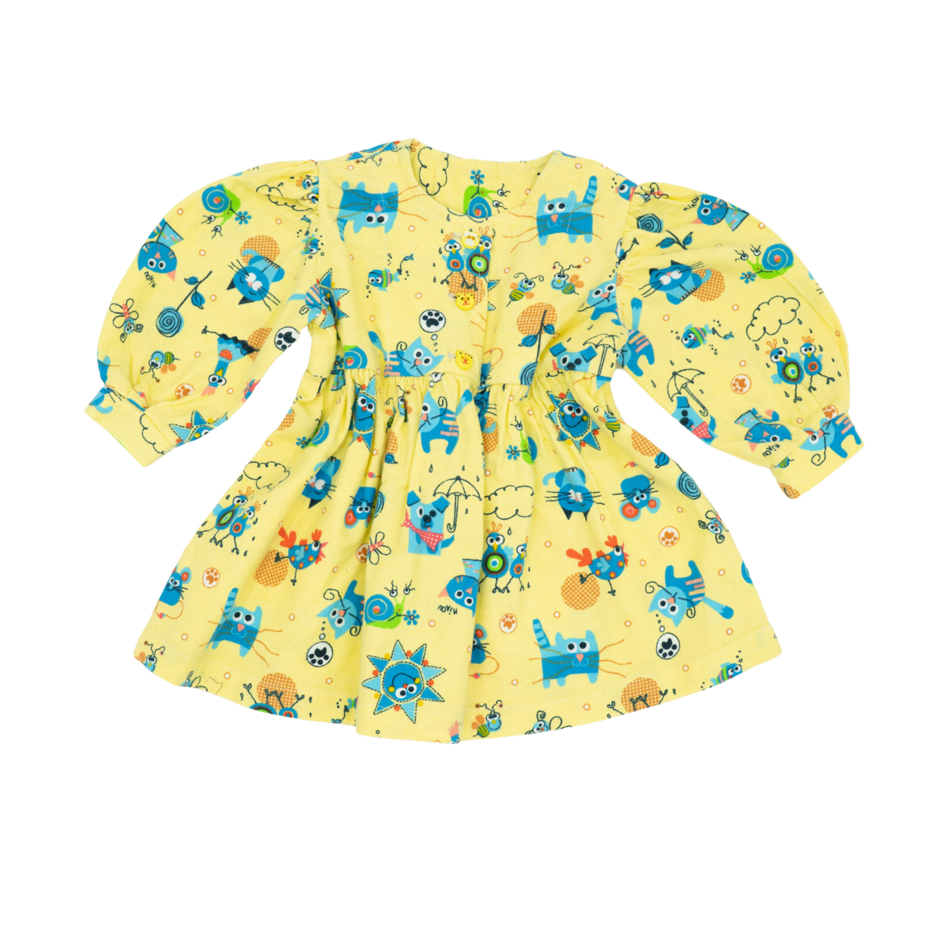 Brighten up any day with this joyful yellow dress featuring a delightful cast of cartoon kitties, snails, and sunshine-filled doodles. Made from soft cotton, this dress combines comfort and whimsy with its puffed long sleeves, gathered waist, and twirly skirt—perfect for curious little explorers.