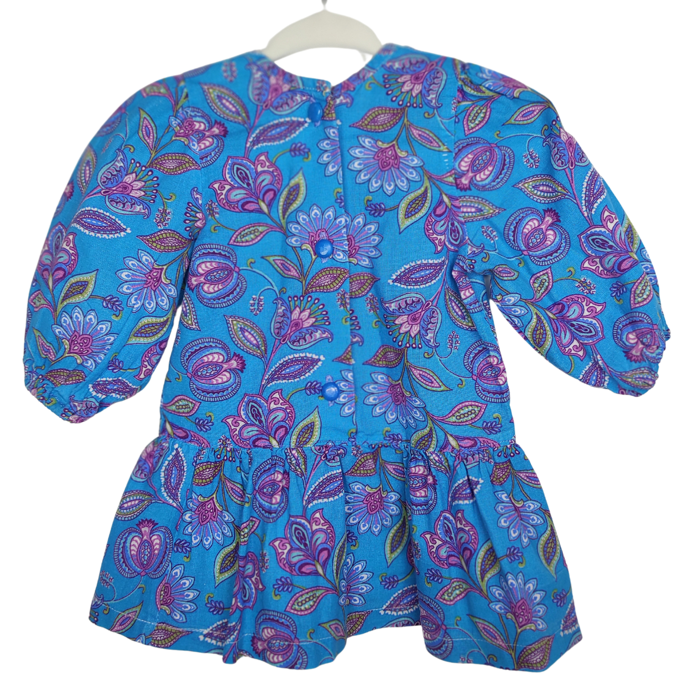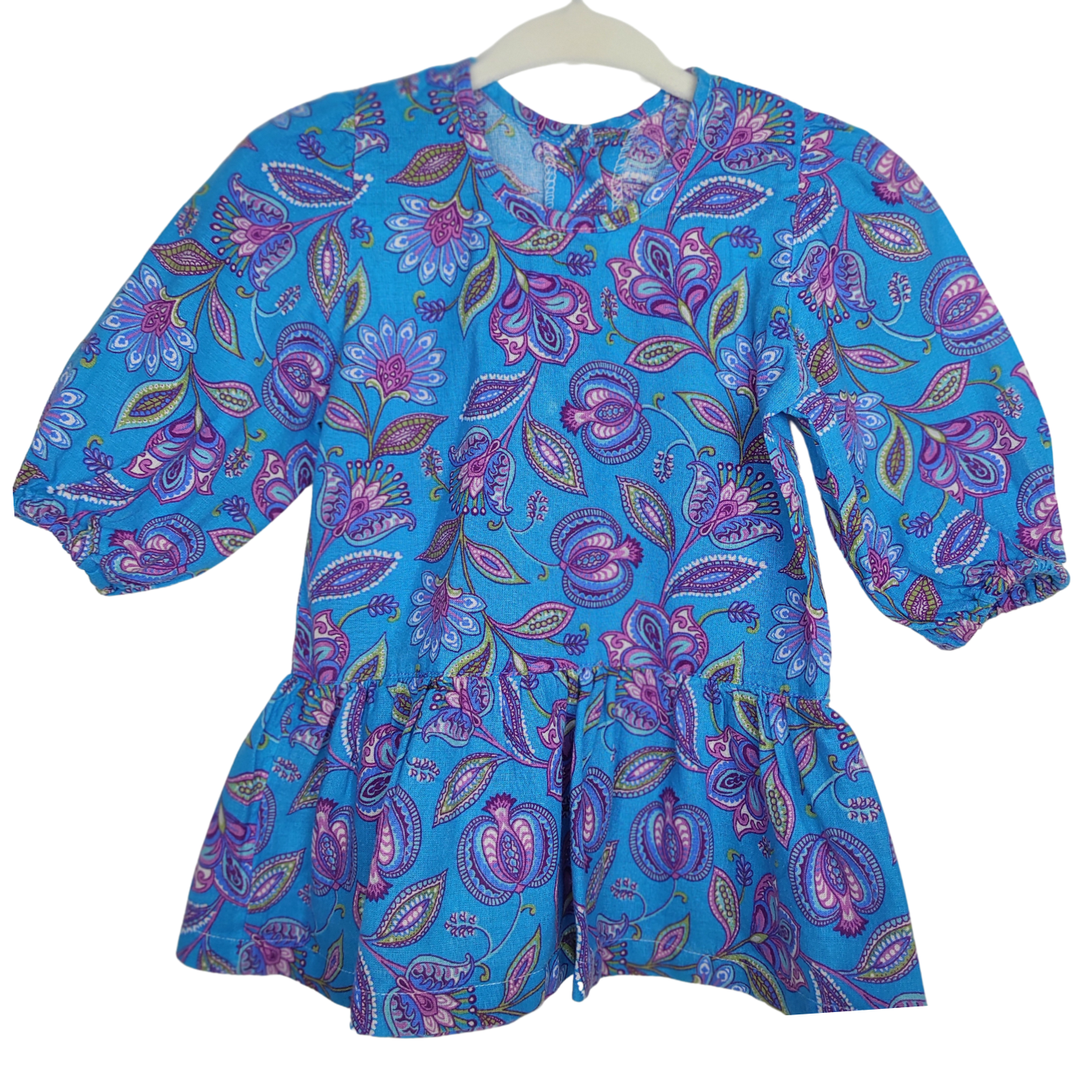 Bring a burst of joy to your little one's wardrobe with this handcrafted floral dress. Made from high-quality, breathable cotton, this piece features a vivid blue base adorned with intricate pink, purple, and green floral patterns. The relaxed A-line silhouette, gathered waist, and flared hem create a playful and comfortable fit—perfect for everyday charm or special moments.