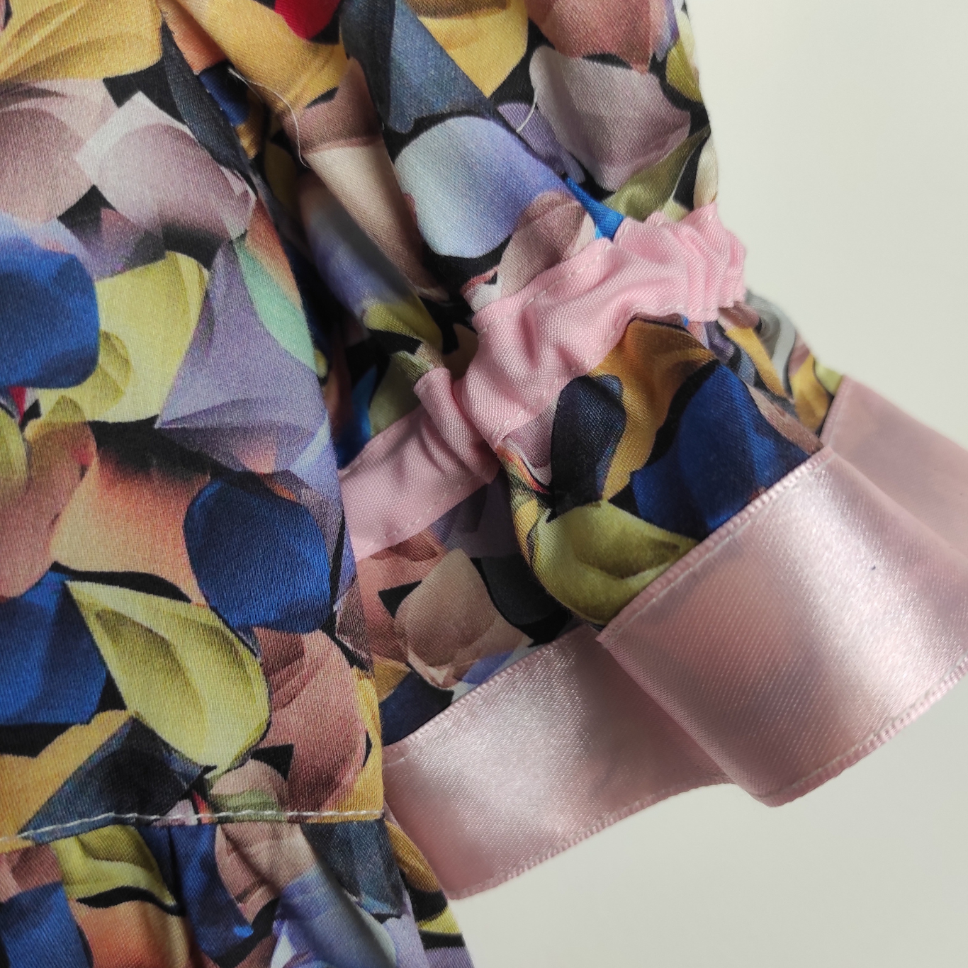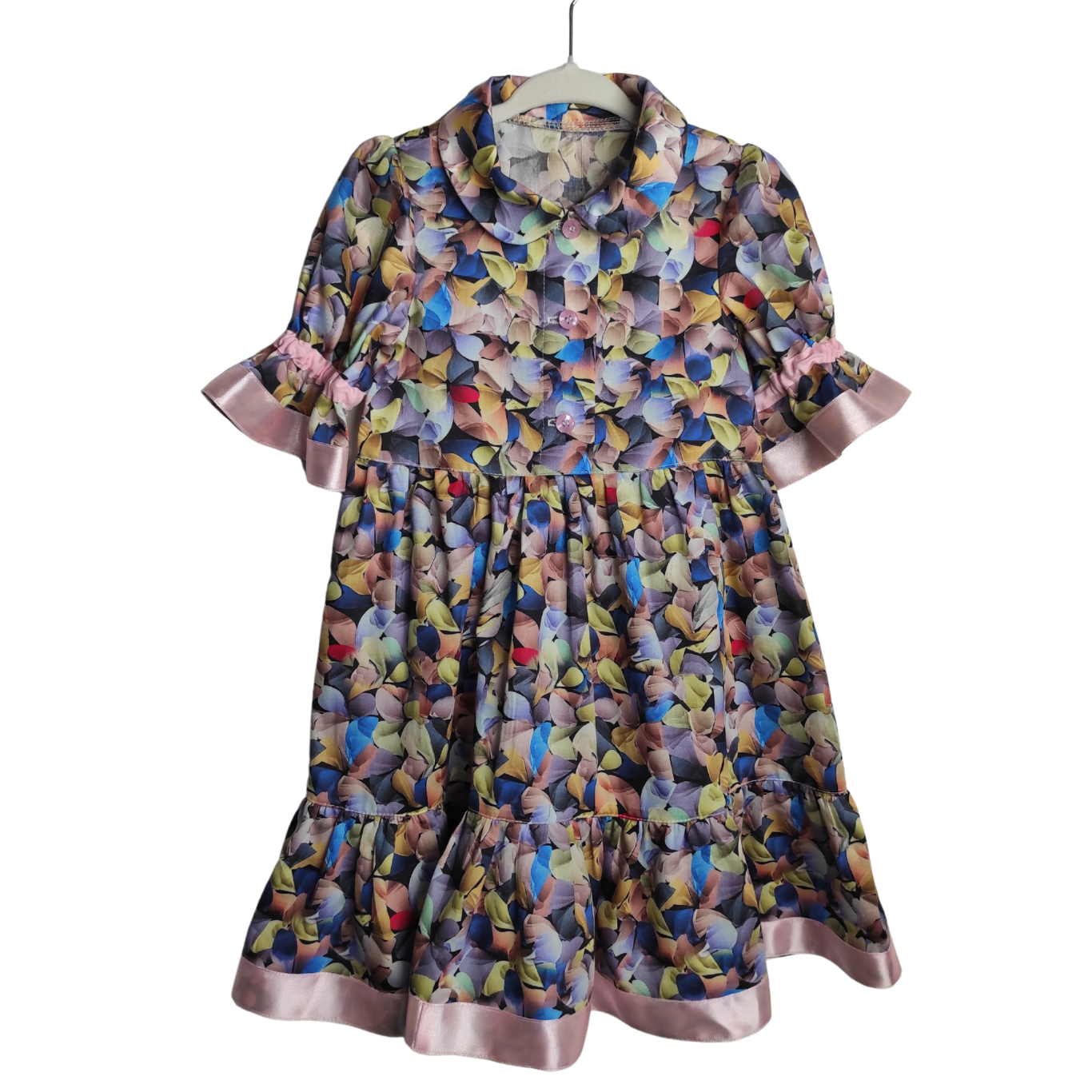 Bursting with color and personality, this stunning dress features an abstract floral swirl in a kaleidoscope of earthy tones, from mustard yellow to blush pink, deep blue, and soft lilac. Crafted for movement and joy, the dress has short puffed sleeves and a layered skirt trimmed in a shimmering lavender satin ribbon that adds a graceful finishing touch.